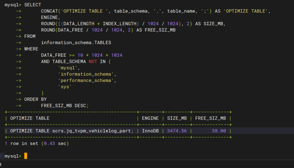 ROUND(DATA_FREE / 1024 / 1024, 2) AS FREE_SIZ_MB