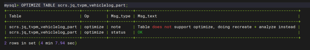 OPTIMIZE TABLE scrs.jq_tvpm_vehiclelog_part;